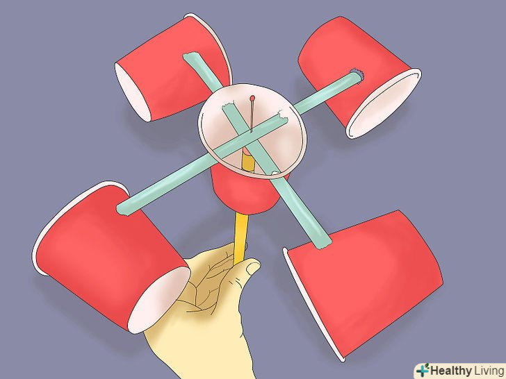 Зробіть базу для анемометра.поправте обидві соломинки, щоб всі чотири чашки опинилися на однаковій відстані від центру. Вставте невелику шпильку через точку перетину двох соломинок. Вставте олівець з гумкою на кінці через отвір в основу стаканчика центральної чашки, і обережно застроміть на нього булаву. Тепер ви можете тримати анемометр за кінчик олівця, і використовувати його для вимірювання швидкості вітру.