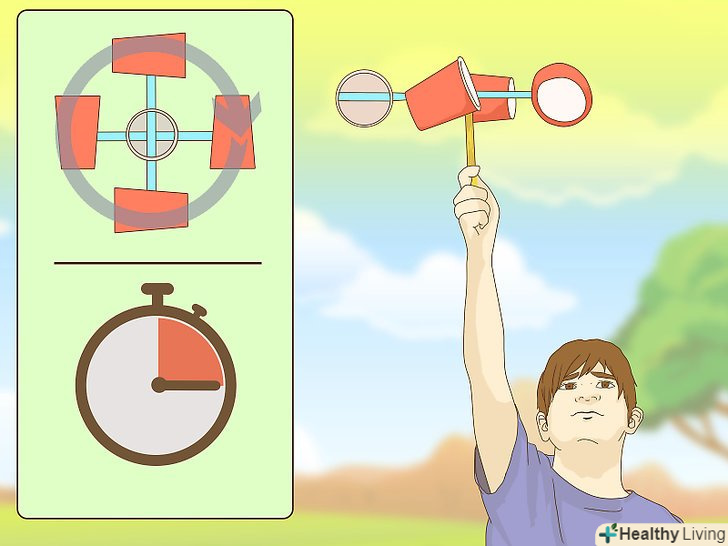 Підрахуйте кількість обертів, яке робить анемометр.Тримайте анемометр вертикально у вітряній області. Слідкуйте за одним стаканчиком (відзначте його маркером для легкості) і підрахуйте кількість оборотів, що здійснюються ним. Використовуючи секундомір, засічіть час 15 секунд, і припиніть відлік. Помножте отримане число на чотири, щоб отримати кількість оборотів в хвилину (об/хв).- Для більшої точності порахуйте число обертів стаканчика за 60 секунд (тоді, не потрібно множити на 4).