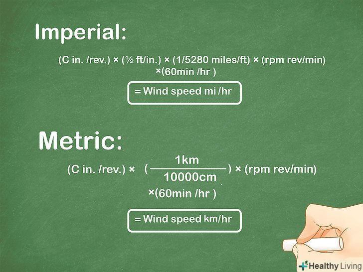 - Метрична система одиниць: (__ окружність _ _ дюймів/оборот) * (1/100000 км/см) * (__rpm__ об/хв) * (60 хвилин/год) = __швидкість вітру__ в км.на годину.