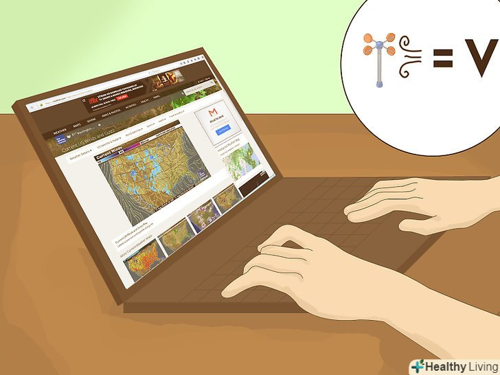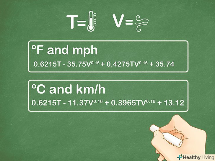 Знайдіть або виміряйте швидкість вітруV .ви можете знайти оцінку швидкості вітру на більшості сайтів прогнозу погоди або онлайн, шляхом пошуку " швидкість вітру +(назва вашого міста)". Якщо у вас є анемометр (ви можете зробити його самі за допомогою інструкцій, прикладених нижче), то ви можете виміряти швидкість вітру самостійно. Якщо ви вимірюєте температуру в ºF, то використовуйте вимірювання швидкості вітру в милях на годину (миль на годину). Якщо ви вимірюєте в ºC, то використовуйте вимірювання швидкості вітру в кілометрах на годину (км / год).[2] при необхідності, використовуйте [http://www.metric-conversions.org/speed/knots-to-kilometers-per-hour.htm веб-сайт для конвертації вузлів у км / год.- Якщо ви використовуєте офіційно прийняте вимірювання швидкості вітру в 33 фути (10 м), то помножте його на 0,75, щоб отримати приблизну оцінку швидкості вітру на 5 футів (1,5 м), що приблизно відповідає рівню людського обличчя.[3][4]
