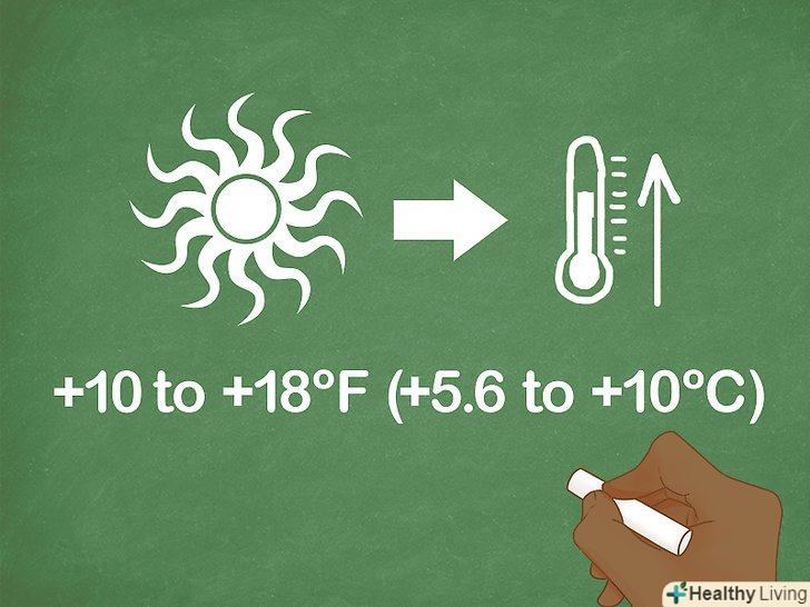 Відрегулюйте відповідно до сонця.яскраве сонце сприяє підняттю температури до + 10 - +18ºf (+5.6 - + 10ºC).[8] немає офіційної формули, що вимірює цей ефект, однак вам потрібно бути в курсі, що під впливом сонця погода буде здаватися тепліше, ніж покажуть вимірювання, зроблені за формулою охолодження вітром.