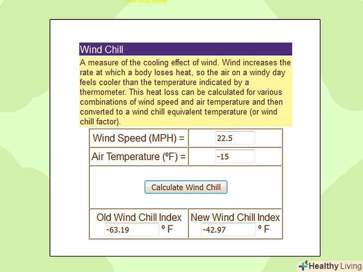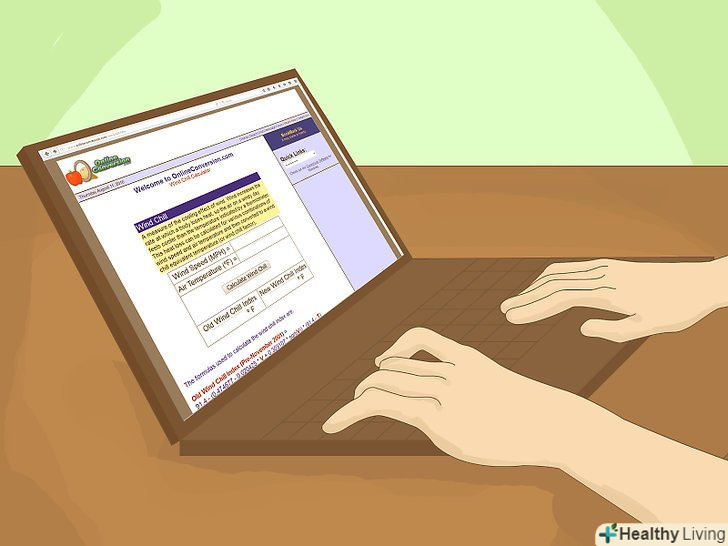 Знайдіть онлайн калькулятор розрахунку коефіцієнта охолодження вітром. спробуйте наступні сайти: the US National Weather Service, freemathhelp.com, Або onlineconversion.com.- Всі ці калькулятори використовують нову формулу охолодження вітром, прийняту в США та інших країнах в 2001 році. Якщо ви використовуєте інший калькулятор, спробуйте знайти той, який використовує цю формулу. Розрахунки, виведені за старими формулами, можуть вийти помилковими.