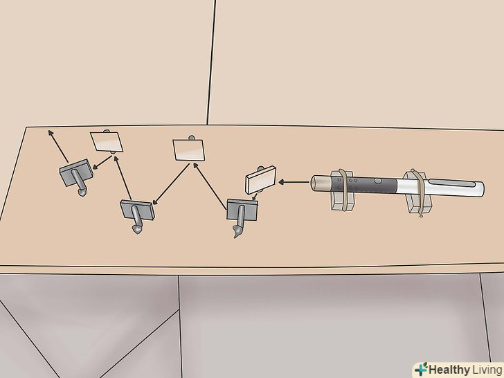 Обертаючи лінзу сфокусуйте лазерний промінь.направте його на стіну і фокусуйте, поки не з'явиться хороша, яскрава точка.- Після того як ви відрегулювали лінзу таким чином, помістіть сірник на лінію променя і обертайте лінзу поки не побачите, що сірникова головка почне диміти. Можна також спробувати лопати повітряні кулі або пропалити отвори в папері.
