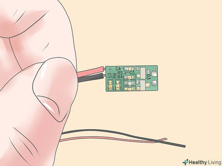 Підключіть лазерний діод до драйвера. слід з'єднати позитивний контакт з позитивним висновком схеми драйвера, негативний контакт з негативним. Розташування контактів відрізняється в залежності від того, що використовується - червоний діод від пише DVD або блакитний діод від пише Blu-Ray.- Візьміть лазерний діод з висновками у напрямку до вас, поверніть його таким чином, щоб ніжки утворили трикутник, який вказує вправо. На обох типах діодів ніжка вгорі є позитивним контактом.