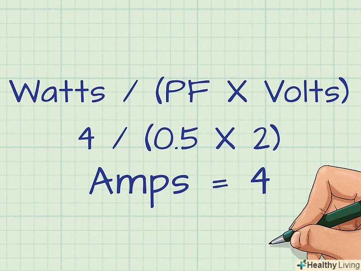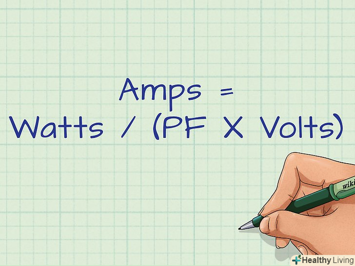 Скористайтеся рівнянням для однофазних ланцюгів. рівняння для однофазних ланцюгів змінного струму аналогічно рівнянню, використаному вище для постійного струму, і пов'язує Вольти, ампери і вати. Різниця полягає в тому, що для змінного струму в рівняння входить коефіцієнт потужності.[9]- Ампери = вати / (КМ x Вольти), де коефіцієнт потужності (КМ) є безрозмірною величиною.