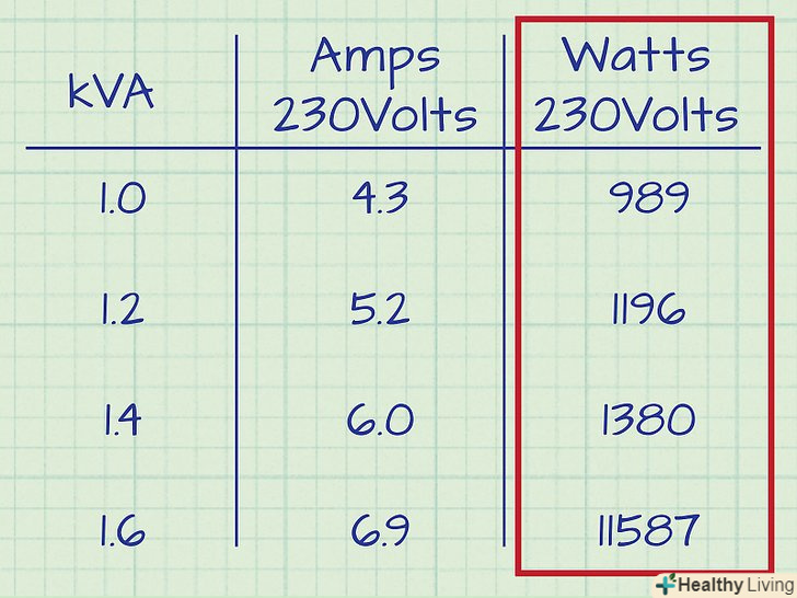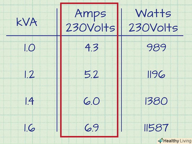 Знайдіть відповідний струм (в амперах).після того як ви знайдете цікаву для вас потужність (в ватах), перейдіть уздовж цього ж рядка до стовпця "струм" або "ампери". У таблиці може бути більше двох стовпців, тому звертайте увагу на їх заголовки, щоб не помилитися. Знайшовши стовпець зі значеннями струму в амперах, ще раз перевірте, щоб відповідне значення струму знаходилося в тому ж рядку, що і цікавить Вас потужність в ватах.[3]