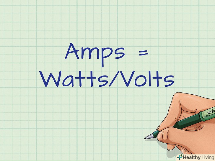 Запишіть рівняння.для постійного струму рівняння виглядає дуже просто. Вати рівні амперам, поділеним на Вольти. Таким чином, поділивши вати на Вольти, ви дізнаєтеся силу струму (кількість ампер) в мережі.[6]- Ампери = вати / Вольти