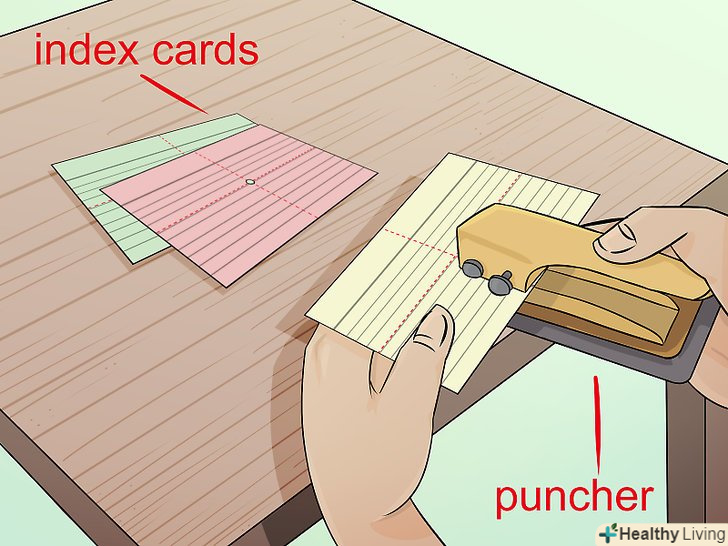 Проколіть отвір у центрі кожної картки.щоб обійтися без зайвих вимірювань, візьміть картку і за допомогою лінійки проведіть дві діагональних лінії, які з'єднують протилежні кути. Виконайте те ж саме для двох інших карток.- Візьміть дирокол і проколіть картку в місці перетину двох діагоналей. Повторіть те ж саме для двох інших карток.