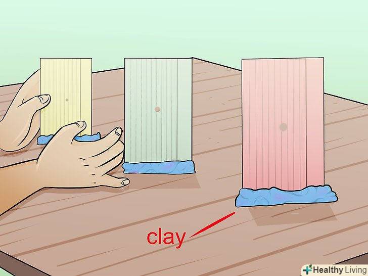 Закріпіть картки пластиліном.необхідно встановити картки вертикально вздовж прямої лінії на рівній відстані один від одного.- Зліпите з пластиліну підставки для карток, так щоб вони стояли вертикально. За допомогою лінійки розмістіть картки на відстані 5-13 сантиметрів один від одного.