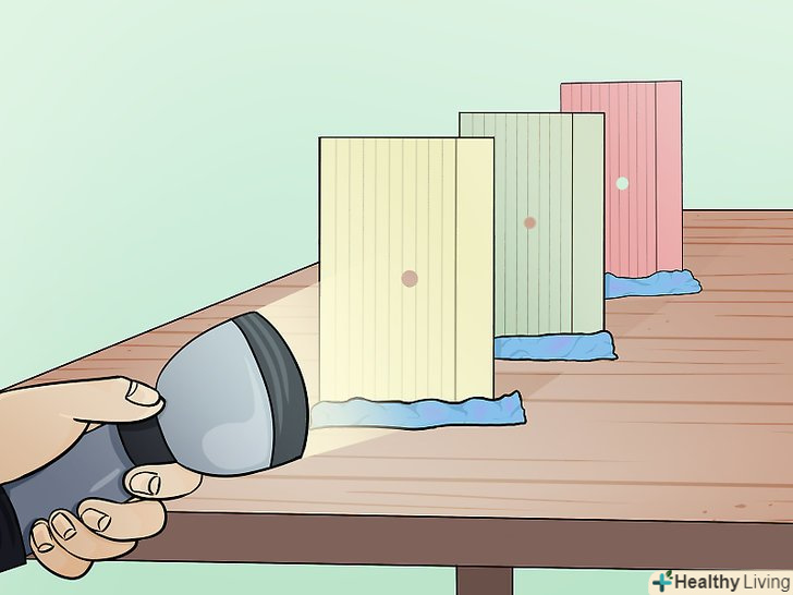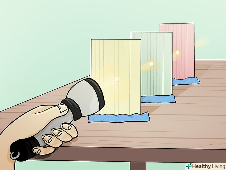 Розмістіть ліхтарик або лазерну указку по одну сторону від ряду карток.направте ліхтарик (указку) таким чином, щоб його світло падало на отвір в найближчій до нього картці. Увімкніть ліхтарик або лазерну указку.- При необхідності поправте картки таким чином, щоб всі три отвори розташовувалися уздовж прямої лінії і світло проходило крізь них. Після цього ви побачите, як промінь світла падає на стіну або іншу поверхню, розташовану позаду останньої картки.