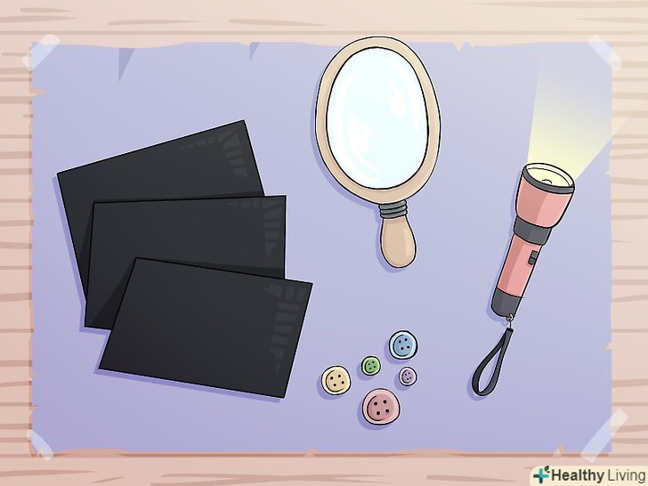 Увімкніть ліхтарик.той, у кого ліхтарик, повинен включити його і направити в сторону від аркуша паперу з дрібними предметами.- Другий учасник повинен розташувати дзеркало так, щоб світло падало на дрібні предмети. Піднесіть дзеркало ближче до ліхтарика і розгорніть його під таким кутом, щоб висвітлити предмети.