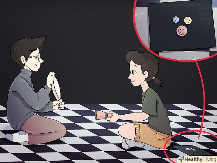 Одна людина повинна тримати ліхтарик, а другий — дзеркало.людина з ліхтариком повинен сісти перед аркушем паперу, звернувшись спиною до нього. Другий учасник повинен тримати дзеркало так, щоб воно було звернене до паперу з дрібними предметами.