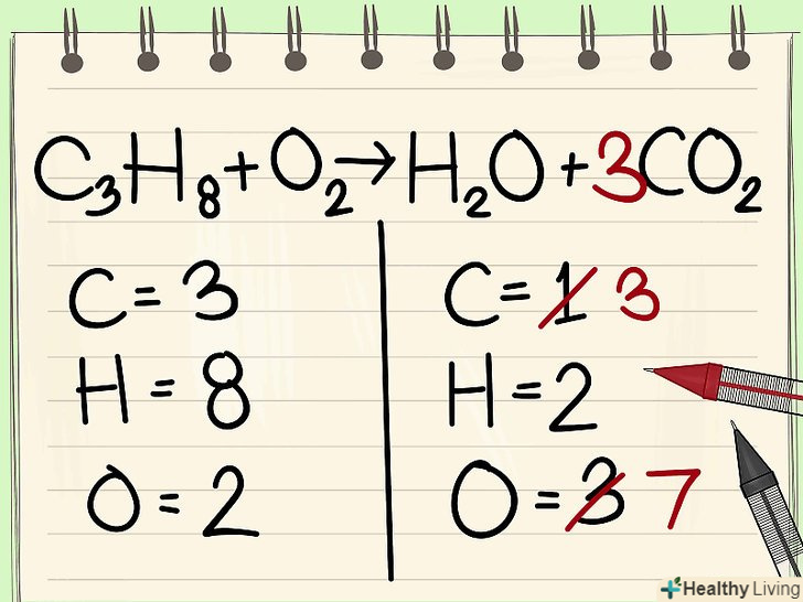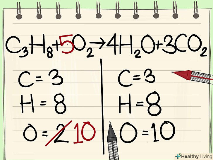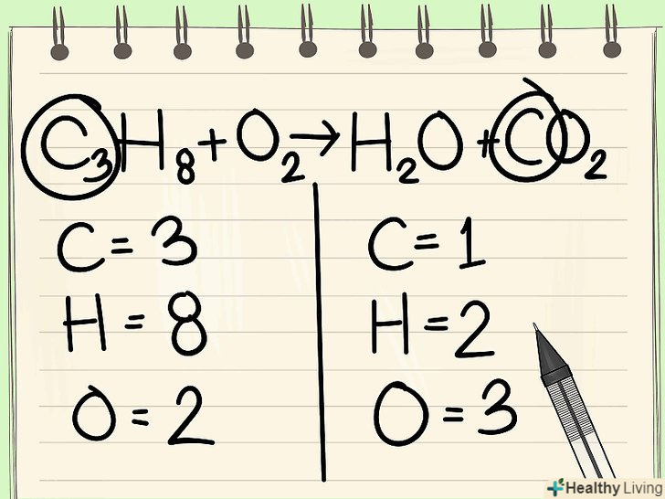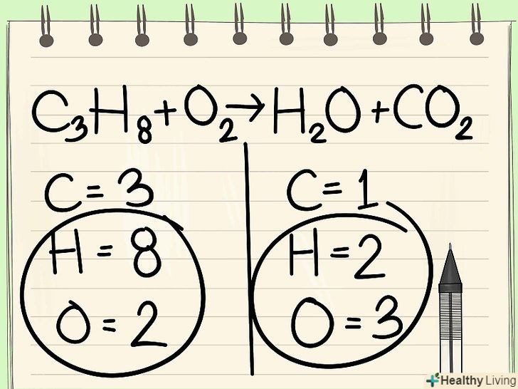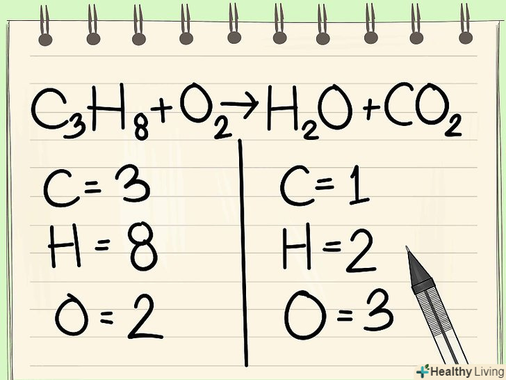 Після цього збалансуйте атоми водню.після того як ви зрівняли кількість атомів вуглецю в лівій і правій частині, незбалансованими залишилися водень і кисень. Ліва частина рівняння містить 8 атомів водню, стільки ж їх повинно бути і справа. Досягніть цього за допомогою коефіцієнта.[6]- C3H8 + O2 –gt; 4H2O + 3CO2