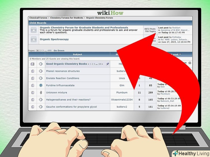 Пошукайте відповіді на свої питання на форумах.на щастя, в Інтернеті багато хто шукає потрібну їм інформацію з органічної хімії, і там є люди, у яких є відповіді. Існують форуми, присвячені органічній хімії, де обговорюються складні теми. Спробуйте розмістити завдання, яке ви не можете вирішити, і поспілкуйтеся з людьми, які викличуться вам допомогти.- Якщо ви володієте англійською мовою, вам підійдеchemicalforums.com.[7]