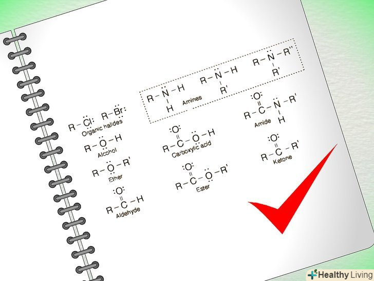Знайте необхідні функціональні групи.в органічній хімії використовується один і той же набір структур практично у всіх молекулах. Ці структури називаються функціональними групами. Якщо ви навчитеся впізнавати їх і будете знати, як вони поводяться при реакціях, ви зможете впоратися із завданнями з хімії. Оскільки функціональні групи зазвичай завжди реагують однаково, знання їх властивостей допоможе вам в самих різних вправах.- В органічній хімії дуже багато функціональних груп, і перерахувати все в цій статті неможливо. Знайти навчальні матеріали з цієї теми неважко. Наприклад, можна почитати про цездесь.