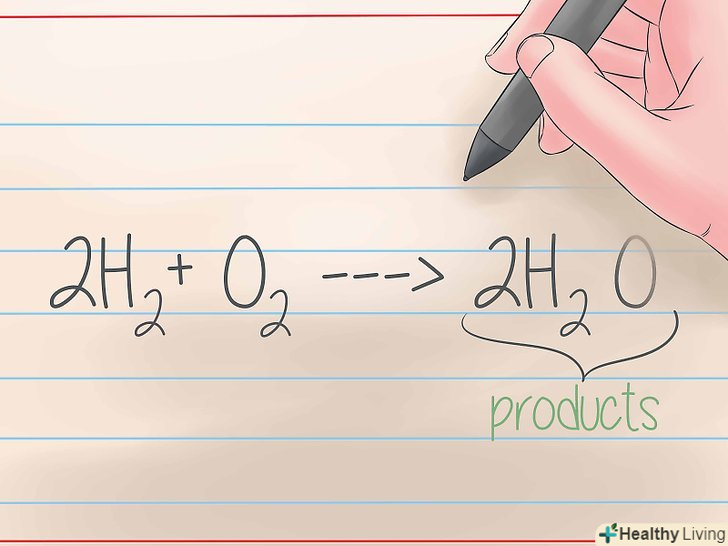 Визначте продукти реакції.вони записуються з правого боку стрілки і позначають хімічні речовини, що утворилися в результаті реакції. Продукти реакції також записуються у вигляді атомів, молекул, або їх комбінації.- Продуктом реакції Fe + O2 -- gt; Fe2O3 є оксид заліза (III), або іржа.