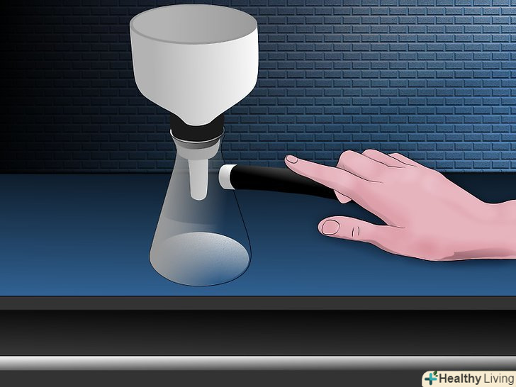 - Фільтрація з використанням воронки Бюхнера: помістіть шматок нерифленого фільтрувального паперу на дно воронки Бюхнера і намочіть розчинником. Щільно встановіть воронку в пробірку за допомогою адаптора з гуми або синтетичного каучуку, щоб використовувати вакуумне відсмоктування. Вилийте і відшліфуйте кристали в воронку і вимкніть аспіратор, як тільки вся рідина буде видалена, а кристали залишаться на папері. Сполосніть кристалізаційну пробірку холодним розчинником, додайте залишки до кристалів і знову використовуйте вакуум до видалення рідини. Повторюйте і промивайте кристали стільки разів, скільки знадобиться. Залиште аспіратор включеним до висихання кристалів.