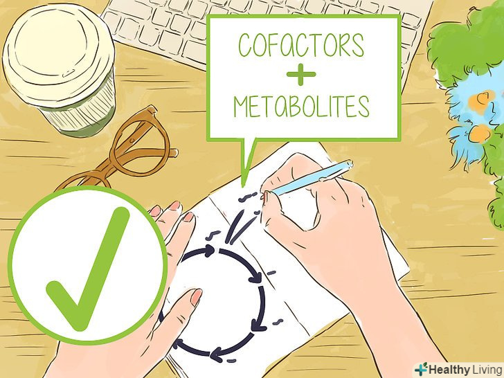 Вивчіть коферменти та метаболіти.тепер ознайомтеся з даними шляхом більш детально. Метаболіти являють собою проміжні продукти, які утворюються в ході процесу, вони використовуються в наступних реакціях. Існують також коферменти, які роблять реакцію можливою або прискорюють її.[14]- Не заучуйте матеріал автоматично, без розуміння. Звертайте увагу на те, як одні речовини перетворюються в інші, щоб дійсно розуміти даний процес, а не просто визубрити його.[15]