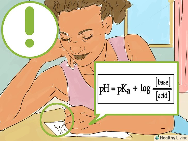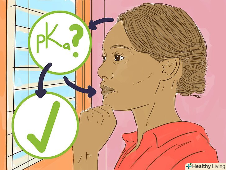 Навчіться знаходити pH по pKa за допомогою рівняння Гендерсона-Гассельбаха.це рівняння використовують для приготування буферних розчинів в лабораторних умовах.[6] рівняння Гендерсона-Гассельбаха записується в наступному вигляді: pH = pKa + lg[підстава]/[кислота]. Величина pKa розчину дорівнює рівню pH даного розчину в тому випадку, якщо концентрації кислоти і підстави однакові.[7]- Буферним називається такий розчин, рівень pH якого не змінюється при додаванні помірної кількості кислоти або основи. Такі розчини важливі для підтримки постійного рівня pH.[8]