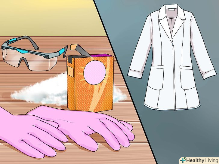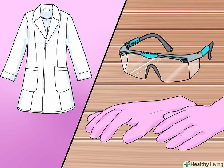 Подбайте про техніку безпеки.вам знадобляться захисні окуляри, лабораторний халат або щільна сорочка з довгими рукавами, щоб захиститися від можливих бризок, а також кислотостійкі рукавички з латексу або нітрилу. Слід також запастися пачкою харчової соди (бікарбонату натрію), щоб при необхідності нейтралізувати кислоту.- Сірчана кислота дуже агресивна. Будьте обережні і не пролийте або не розбризкуйте її.
