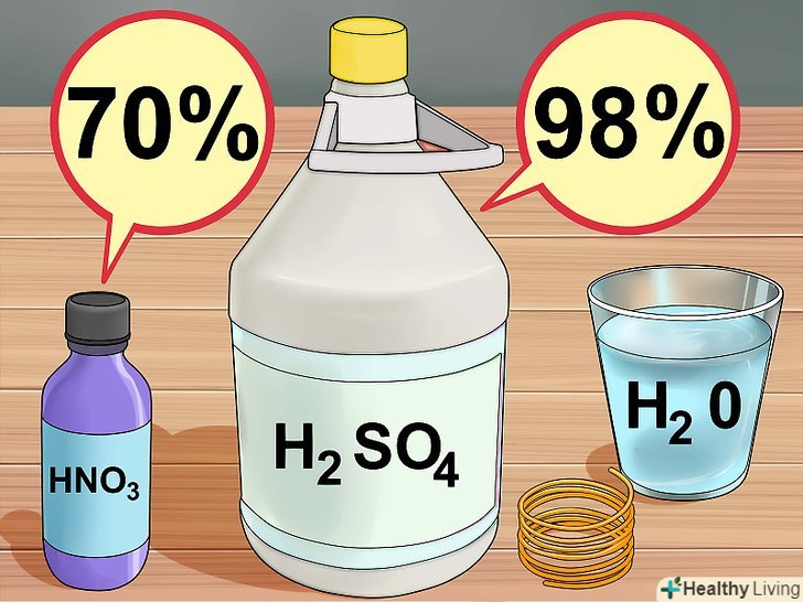 Зберіть необхідні матеріали.вам буде потрібно вода, азотна кислота (70%) і концентрована (98%) сірчана кислота. Ці реагенти можна придбати в магазині хімічних реактивів. Крім того, буде потрібно мідний дріт довжиною 7-10 сантиметрів або трохи Мідного брухту, які можна придбати в магазині господарських товарів.[10]