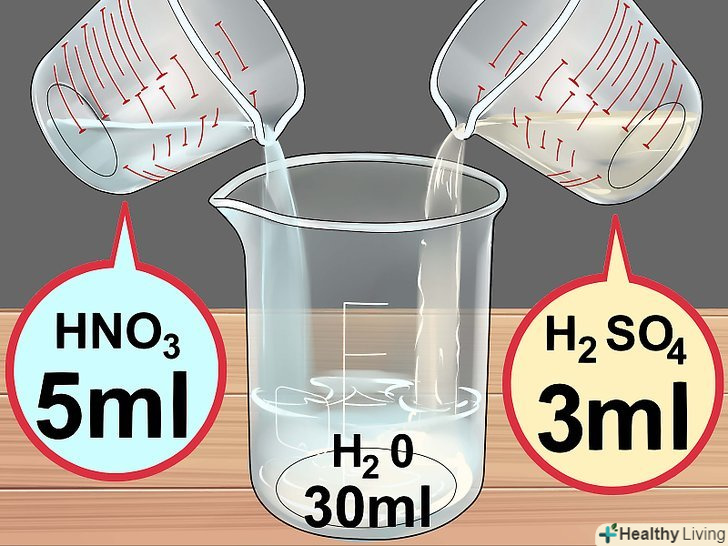 Приготуйте розчин кислот.спочатку налийте в хімічний стакан 30 мілілітрів води, потім додайте 5 мілілітрів азотної кислоти і 3 мілілітри концентрованої сірчаної кислоти.[11]