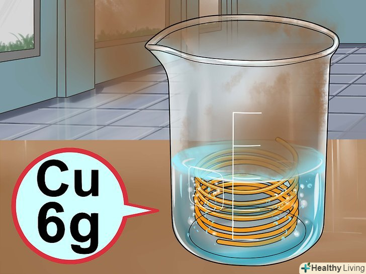 Додайте мідь.обережно покладіть в розчин близько 6 грамів міді. Відступіть назад, щоб не дихати парами, і спостерігайте за реакцією. Ви побачите, як у міру розчинення міді в розчині виділяються бульбашки коричневого газу, і рідина забарвлюється в синій колір. Реакція завершиться, коли припиниться утворення бульбашок газу.[12]- Газ, що виділяється при реакції, токсичний, і його не слід вдихати.