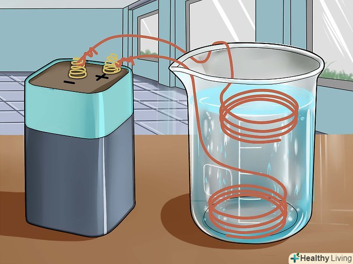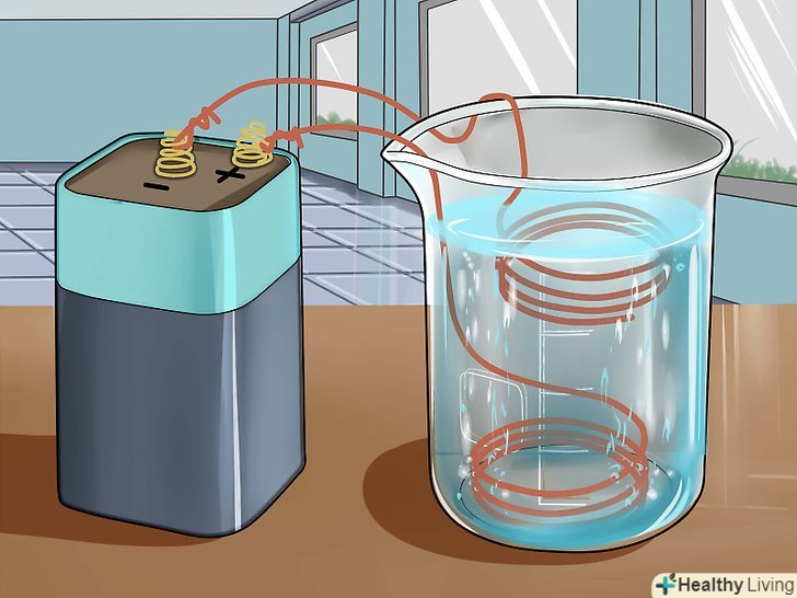 Зберіть необхідні матеріали та інструменти.вам знадобиться 6-вольтова батарея, скляний хімічний стакан або кружка, 2 мідних зволікання, концентрована сірчана кислота (її можна придбати в магазині хімічних реактивів), скляна мірна мензурка або піпетка і вода.- Якщо у вас немає концентрованої сірчаної кислоти, можна використовувати акумуляторну кислоту, яку можна придбати в магазині господарських товарів або автомагазині. В акумуляторній кислоті міститься 30-35% сірчаної кислоти.