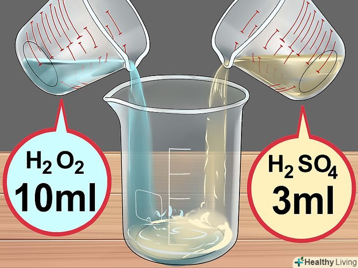 Приготуйте розчин кислоти.налийте в хімічний стакан 10 мілілітрів 30% перекису водню, потім додайте в нього 3 мілілітра концентрованої сірчаної кислоти. У вас вийде так звана суміш "Піранья", яка швидко розігріється, так що будьте надзвичайно обережні.- Ні в якому разі не накривайте склянку або іншу посудину з даним розчином, так як він може вибухнути.