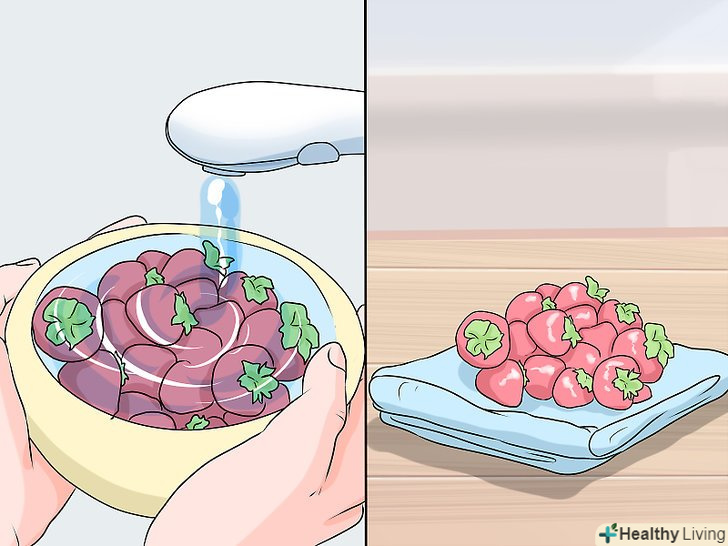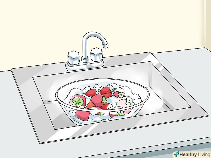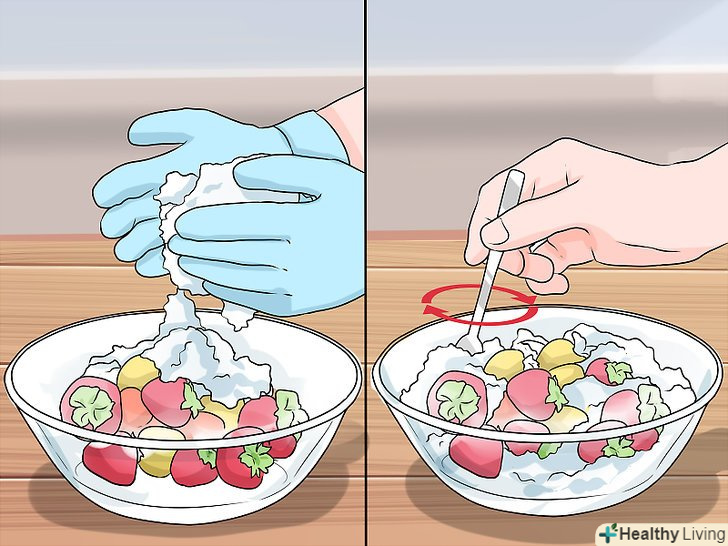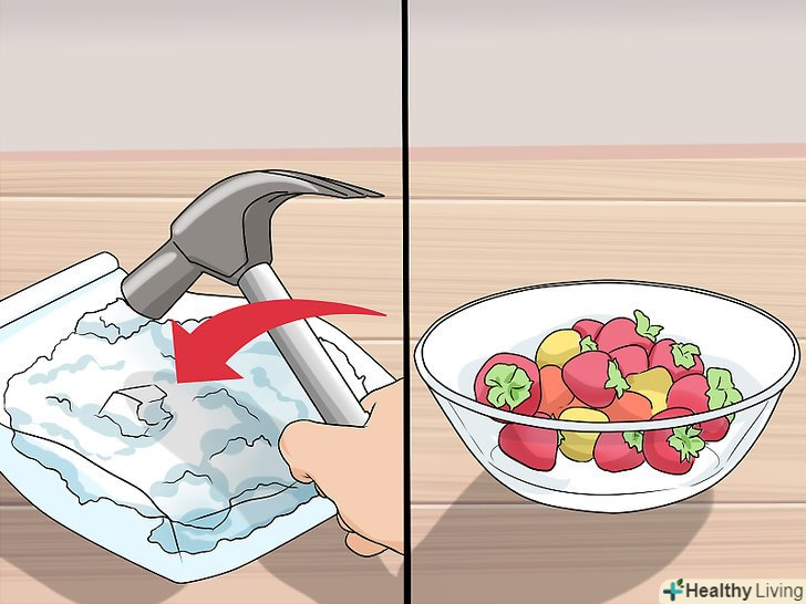 Потовчіть сухий лід і покладіть ягоди в миску.після того як ягоди висохнуть, їх можна перекласти в миску і змішати там з сухим льодом. Дістаньте пакет з сухим льодом і за допомогою молотка розбийте його на дрібні шматочки, не виймаючи з пакета.[20]- Якщо при цьому сухий лід може розлетітися в сторони, рекомендується надіти захисні окуляри і маску, щоб захистити очі і обличчя від осколків льоду. Як варіант, можна відразу купити сухий лід у вигляді гранул.[21]
