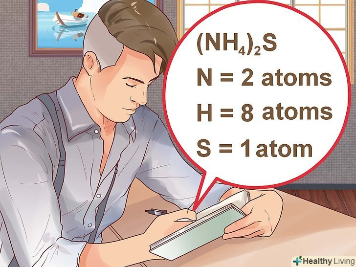 - Якщо формула з'єднання містить дужки, за якими стоїть нижній індекс, то кількість атомів кожного елемента в дужках слід помножити на цей індекс. Наприклад, в з'єднанні (NH4)2s міститься два атоми N, вісім атомів H і один атом S.