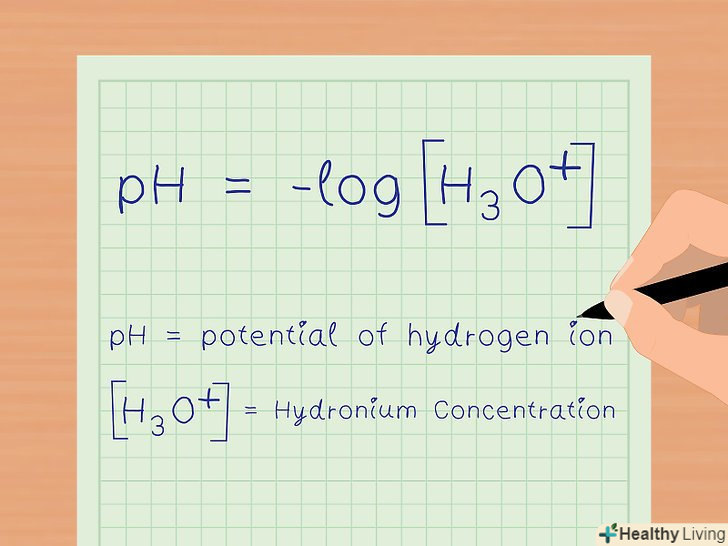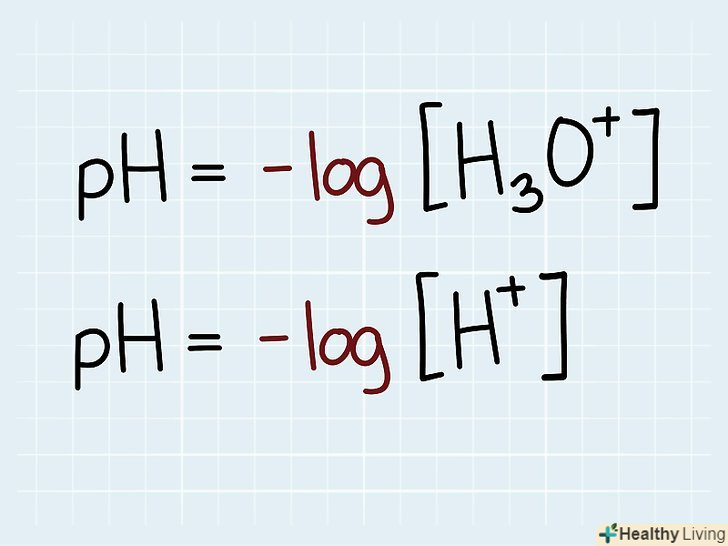 Згадайте формулу для знаходження pH.ось ця формула: pH = - lg[H3O + ].[7] переконайтеся в тому, що Ви знайомі з усіма елементами, що входять в дану формулу. Подивіться, яка величина відповідає концентрації.- В хімії квадратні дужки означають концентрацію чого-небудь. Так що формула для розрахунку pH читається як»pH дорівнює негативному логарифму концентрації гідроксоній-іонів".