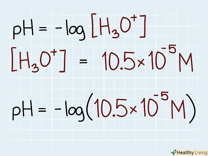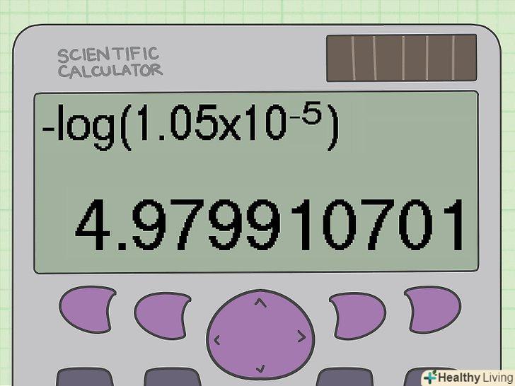 Обчисліть pH.для цього зручно використовувати науковий калькулятор. Спочатку введіть знак мінуса, натиснувши кнопку"+/ -». Потім натисніть кнопку "log", відповідну десятковому логарифму (в англійській мові десятковий логарифм позначається як log). На екрані відобразиться» - log".[9] потім натисніть ліву дужку і введіть концентрацію. При необхідності не забудьте вказати значення ступеня.[10] після цього закрийте дужки.[11] в результаті на екрані калькулятора ви побачите " - log(1,05x105). Натиснути «=». У вас повинно вийти значення pH, приблизно рівне 4,98.