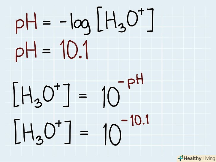 Перетворіть формулу.При цьому вам знадобляться знання зі шкільного курсу алгебри. Для обчислення концентрації за відомим значенням pH необхідно перетворити формулу так, щоб концентрація відокремлено стояла з будь-якої з двох сторін рівняння. Тобто необхідно, щоб по одну сторону знака рівності був вираз, що містить величину pH, а по іншу — концентрація гідроксонію. Спочатку помножте обидві частини рівняння на -1. Потім зведіть 10 в ступені, що стоять по обидві сторони отриманого рівності.- Перетворюючи рівність pH = - log[H3O+], отримуємо формулу +[H3O+] = 10-pH, тобто концентрація іонів дорівнює десяти в ступені-pH. Тепер замість pH підставляємо відоме значення, в нашому випадку 10,1.