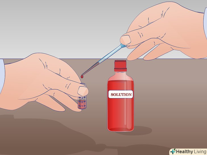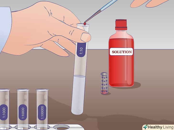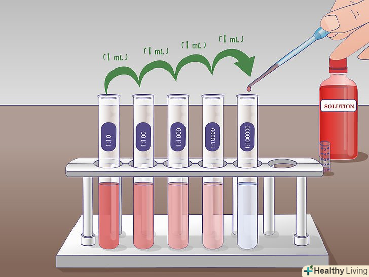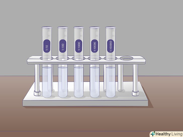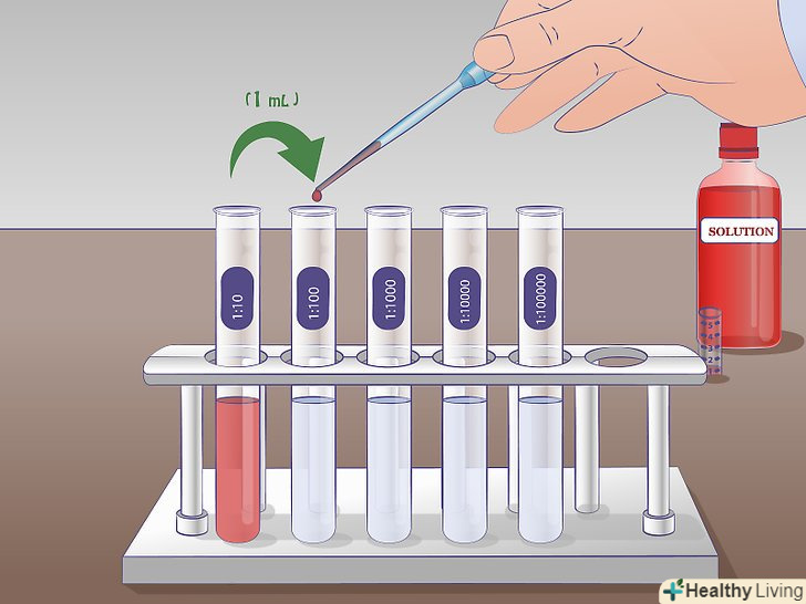 - Кожна наступна пробірка буде містити в 10 разів менше концентрований розчин, ніж попередня.[4] у першій пробірці концентрація розчину складе 1:10, у другій — 1:100, в третій — 1: 1000, і так далі. Заздалегідь визначте, скільки розведень вам знадобиться, і приготуйте відповідне число пробірок.