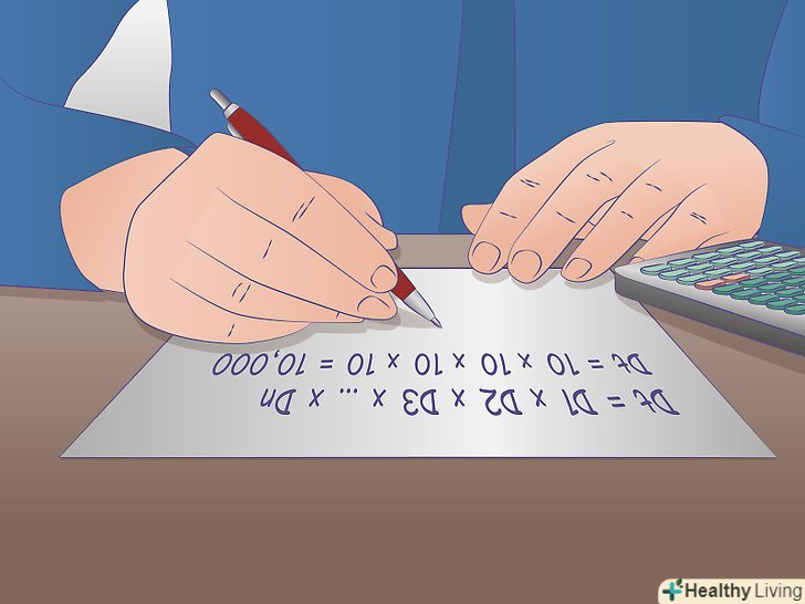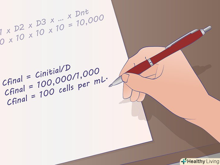 ВизначтеКоефіцієнт розведення кінцевого розчину.для цього слід перемножити всі послідовні коефіцієнти розведення. Відповідна формула має наступний вигляд: D t = D 1x D 2x D 3x ... x Dn, де dt — загальний коефіцієнт розведення, Dn — коефіцієнт n-го розведення.[6]- Припустимо, ви 4 рази провели розведення з співвідношенням 1: 10. Підставимо цей коефіцієнт в формулу і отримаємо DT = 10 x 10 x 10 x 10 = 10.000.