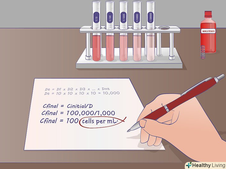 Перевірте розмірність.при проведенні будь-яких розрахунків слід упевнитися, що Ви отримали правильні одиниці виміру.[8] якщо ви почали з кількості клітин на мілілітр, простежте, щоб результат також був отриманий в цих одиницях. Якщо ви проводите розрахунки в проміле (ppm), отримана концентрація також повинна бути виражена в проміле.