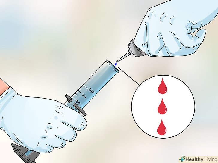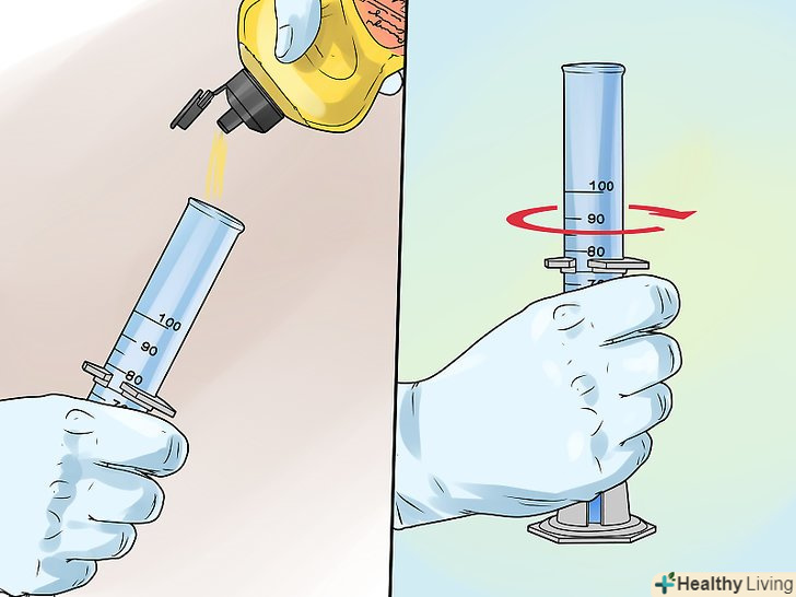Додайте 40 мілілітрів рідкого миючого засобу і розмішайте.влийте невеликий обсяг рідкого миючого засобу в розчин по стінці циліндра.[12] також можна використовувати порошок для миття посуду, який слід ретельно розмішати в розчині.