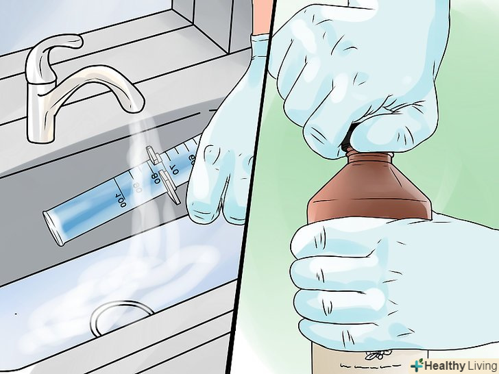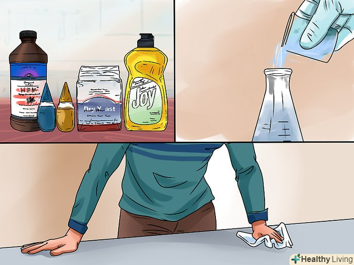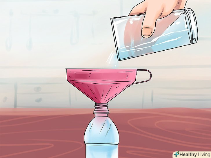 Додайте в пляшку рідину для миття посуду, харчовий барвник і півсклянки перекису водню.переконайтеся, що всі наділи рукавички і захисні окуляри, після чого візьміть перекис водню. Не дозволяйте маленьким дітям брати в руки небезпечний розчин.[3]- Якщо дитина ще маленький, то запропонуйте йому видавити в пляшку рідину для миття посуду і залити харчовий барвник. Для більшого ефекту можна використовувати блиск, але не забудьте переконатися, що він зроблений з пластика, оскільки перекис не можна використовувати разом з металами.[4]