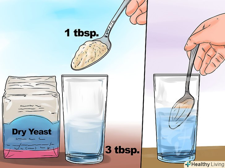 Змішайте 3 столові ложки води з дріжджами. Дозвольте дітям виконати цей крок. Для цього потрібно відміряти дріжджі і змішати їх з необхідною кількістю теплої води. Ретельно розмішайте дріжджі у воді.[2]- Залежно від віку дитини використовуйте ложку або віночок. Також можна надіти окуляри і лабораторний халат. Купіть дитині захисні окуляри в господарському магазині.