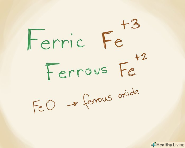Скористайтеся застарілим способом написання назв.відповідно до цього способу написання назв, який використовувався раніше, замість римських цифр використовуються поняття" закисная, окисная "і"перекисна форма". Якщо іон металу має нижчу ступінь окислення (найнижчий числовий заряд незалежно від знака), тоді додавалося слово "закис". Якщо ж він має найвищий заряд, то використовувалося слово "окис" або "перекис". Fe2+ має найнижчий заряд (а Fe3 + – найвищий), тому його позначали як закисное залізо. Назва сполуки fe2 + O – закис заліза.