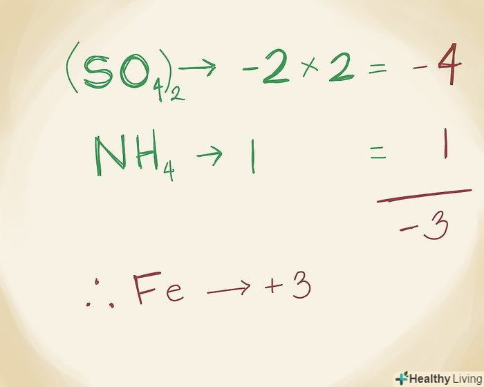 Знайдіть заряд металу.вам потрібно буде виконати деякі арифметичні розрахунки, щоб знайти його. По-перше, Ви знаєте, що сульфат-іон, або so4 має заряд -2, і що в з'єднанні їх два, оскільки під дужками праворуч стоїть двійка. Отже, 2 x -2 = -4. По-друге, ви знаєте, що NH4, або іон амонію, має заряд +1. Складіть -4 і +1 і ви отримаєте -3. Це означає, що іон заліза, Fe, повинен мати заряд + 3, щоб з'єднання було нейтральним.