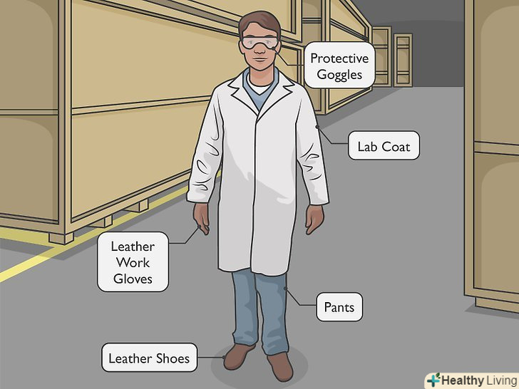 Захистіть руки, очі і кінцівки.сухий лід дуже холодний, він може привести до обмороження ("опіків", по суті), якщо вступить в контакт зі шкірою.[4] незважаючи на те, що при поводженні з вогнегасником немає необхідності використовувати спеціальний захисний костюм, прийміть необхідні запобіжні заходи і захистіть своє тіло від випадкового зіткнення з сухим льодом. Перед початком роботи надіньте:- Щільні і міцні робочі рукавички (можливо, ви захочете надіти тонкі облягаючі рукавички під робочі, для забезпечення додаткового захисту)