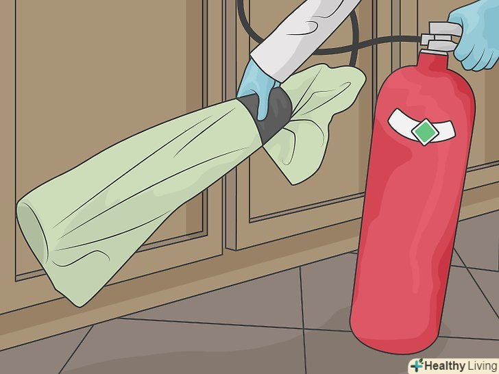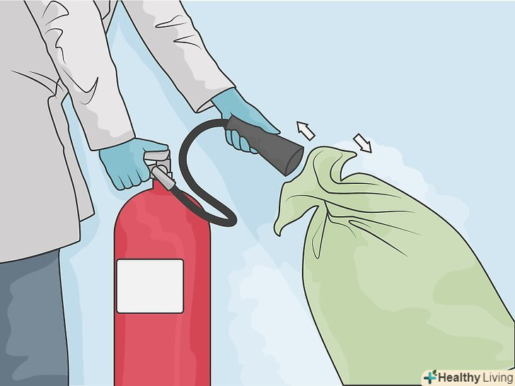 Щільно оберніть наволочку.вставте сопло вогнегасника всередину наволочки. Зберіть тканину наволочки навколо розтруба і щільно зав'яжіть її за соплом. Газ не повинен виходити з щілин.- Якщо ви боїтеся, що наволочка може злетіти, закріпіть її скотчем. Тиск від вогнегасника буде не дуже сильним, але додаткове кріплення не завадить.