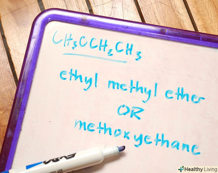 наприклад: CH3OCH2CH3 називається метоксіетан.- Частіше використовуються тривіальні назви простих ефірів. Назвіть вуглеводневі ланцюги як радикали. Розташуйте їх в алфавітному порядку і додайте після них слово "ефір".