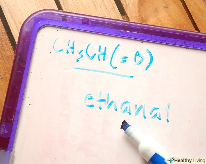 Навчіться давати назви альдегідам.Аль дегіди являють собою вуглеводневий ланцюг з киснем, пов'язаним подвійним зв'язком до останнього / першого вуглецю. Використовуйте для вуглеводневої ланцюга відповідний префікс і додайте суфікс-аналь. Номер вуглецю вказувати не потрібно.