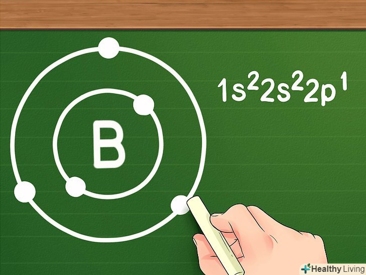 Орбіталі заповнюються електронами за правилом октету: перші два електрони заповнюють 1S-орбіталь, наступні два електрони заповнюють 2S-орбіталь, наступні шість електронів заповнюють 2Р-орбіталь (і так далі). Коли ми маємо справу з атомами неперехідних металів, ми говоримо, що ці орбіталі утворюють навколо атома "орбітальні оболонки", причому кожна наступна оболонка розташована далі, ніж попередня. Два електрона містить тільки перша оболонка, а всі інші оболонки містять по вісім електронів (крім, знову ж таки, атомів перехідних металів). Це називається правилом октету.- Наприклад, розглянемо бор (B). Його атомний номер 5, тобто атом бору включає п'ять електронів, а його електронна конфігурація виглядає наступним чином: 1s22s22P1. Так як перша орбітальна оболонка має тільки два електрона, то можна зробити висновок, що у бора тільки дві оболонки: перша з двома електронами (на 1S-орбіталі), а друга з трьома (на 2S - і 2р-орбіталях).