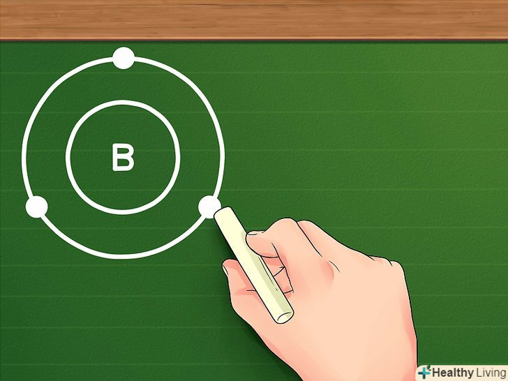 Знайдіть число електронів на зовнішній оболонці.це і буде число валентних електронів певного елемента. Якщо зовнішня оболонка повністю заповнена (іншими словами, якщо вона має вісім електронів або два електрони в разі першої оболонки), то елемент є інертним і не буде легко вступати в реакцію з іншими елементами. Знову ж таки, ці правила не поширюються на перехідні метали.- Наприклад, розглянемо бор. Так як на зовнішній оболонці бору знаходяться три електрона, то можна зробити висновок, що у бору три валентних електрона.