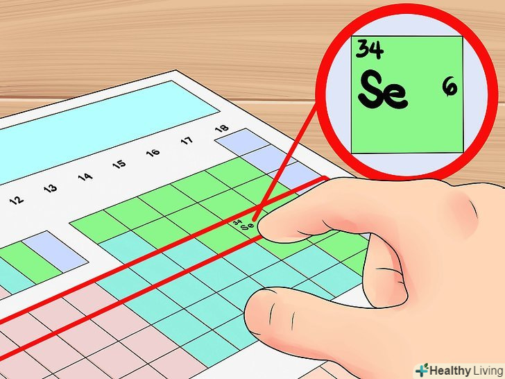 Використовуйте рядки таблиці Менделєєва для визначення числа орбітальних оболонок.рядки періодичної таблиці хімічних елементів називаються періодами. Кожен період відповідає кількості електронних оболонок атомів. Ви можете використовувати це для визначення числа валентних електронів елемента-просто порахуйте порядковий номер елемента в періоді, починаючи зліва. Врахуйте, що даний метод не поширюється на перехідні метали.- Наприклад, ми знаємо, що селен має чотири орбітальні оболонки, оскільки цей елемент знаходиться в четвертому періоді. Так як це шостий елемент (зліва) четвертого періоду (без урахування перехідних металів), можна зробити висновок, що зовнішня четверта оболонка містить шість електронів, і, таким чином, у селену шість валентних електрона.