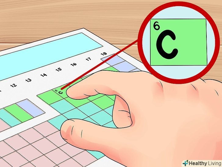 Тепер в таблиці Менделєєва знайдіть елемент, число валентних електронів якого ви хочете знайти. ви можете зробити це за символом елемента( букви в кожній комірці), за його атомним номером (число в лівому верхньому кутку кожної комірки) або будь-який інший доступної Вам інформації.- Наприклад, визначимо число валентних електронів вуглецю (С). Його атомний номер 6 і з нього починається чотирнадцята група.